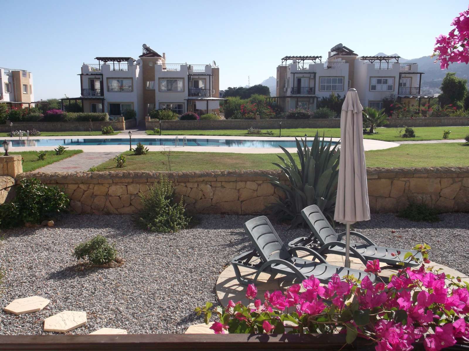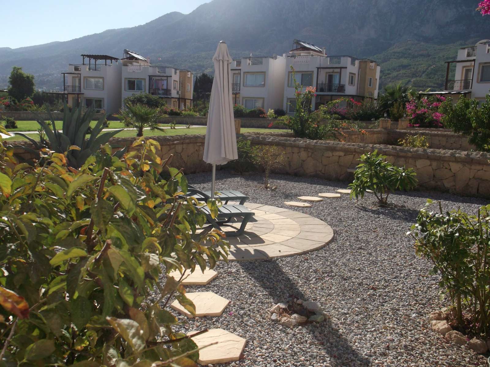 Outside Private walled garden laid to shingle and mature plants, leading to landscaped communal gardens and large communal pool.