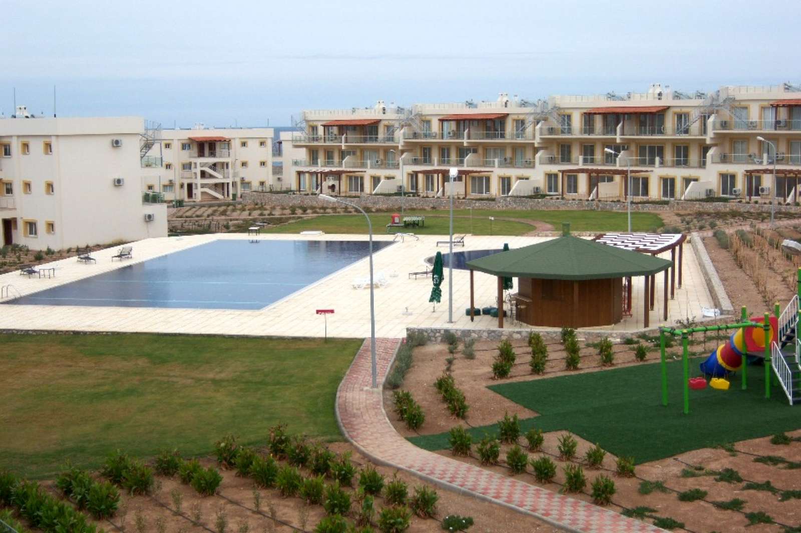 Outside Large communal grounds offering 2 large communal swimming pools, sunbathing terraces with pergola, paddling pool for children, gym, block paved walkways, fencing around the complex.